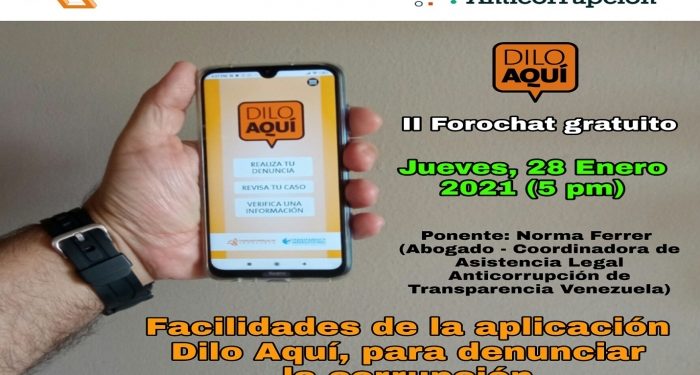 Coalición Anticorrupción, 30 de enero de 2021. Con la participación de 59 personas, la coordinación regional de Transparencia Venezuela y el equipo de trabajo de la Coalición Anticorrupción en el estado Bolívar ofrecieron su segundo foro-chat gratuito para dar a conocer las facilidades de la aplicación Dilo Aquí para denunciar hechos de corrupción en el país.